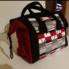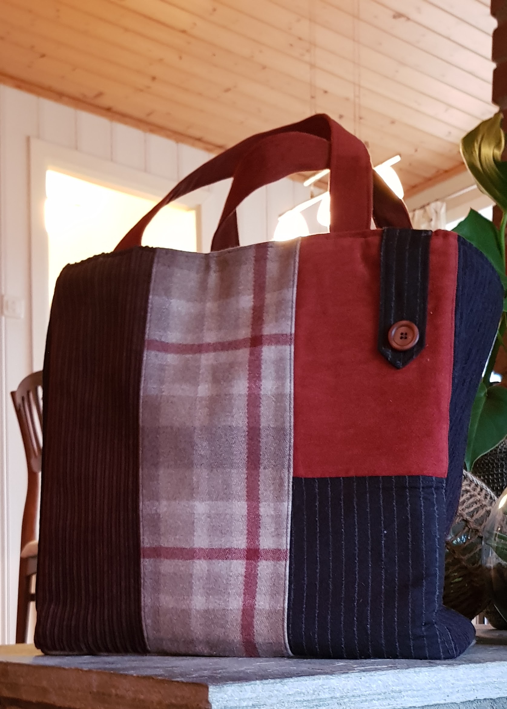 Alle vesker som jeg syr, designer jeg selv. Dvs at jeg ikke bruker mønster som er kjøpt/laget av andre. Ofte er det slik at veien blir til mens jeg går den. Jeg plukker ut stoff som jeg ser passer sammen, og stoffet kan være fra brukte klær, gardiner, pynteputer etc. Jeg hadde lyst til å lage ei veske som hadde praktiske lommer på innsiden, og ei lomme som var tilsvarende like stor som bredden og høyden på veska. Der kunne jeg ha pc, arbeidshefter eller bøker. Jeg fant ei gammel veske på bruktbutikk som kostet 20 kr, og som hadde en pc-lomme. Jeg tok ut innmaten av denne lomma som var av skumplast og laget “sideveggen”. Den beskytteren pc mot harde støt og samtidig støtter opp veska. Foret er laget av dressbukser. Jeg utnyttet linningen på buksa med hempene. Der kan jeg feste husnøkkel/ bilnøkkel. Ellers har den flere lommer på siden og små smale “rom” for penn/blyant. Jeg har hatt og har fortsatt stor glede av denne veska, og har fått mye tilbakemelding på hvor flott den er, og det er hyggelig å høre.