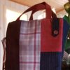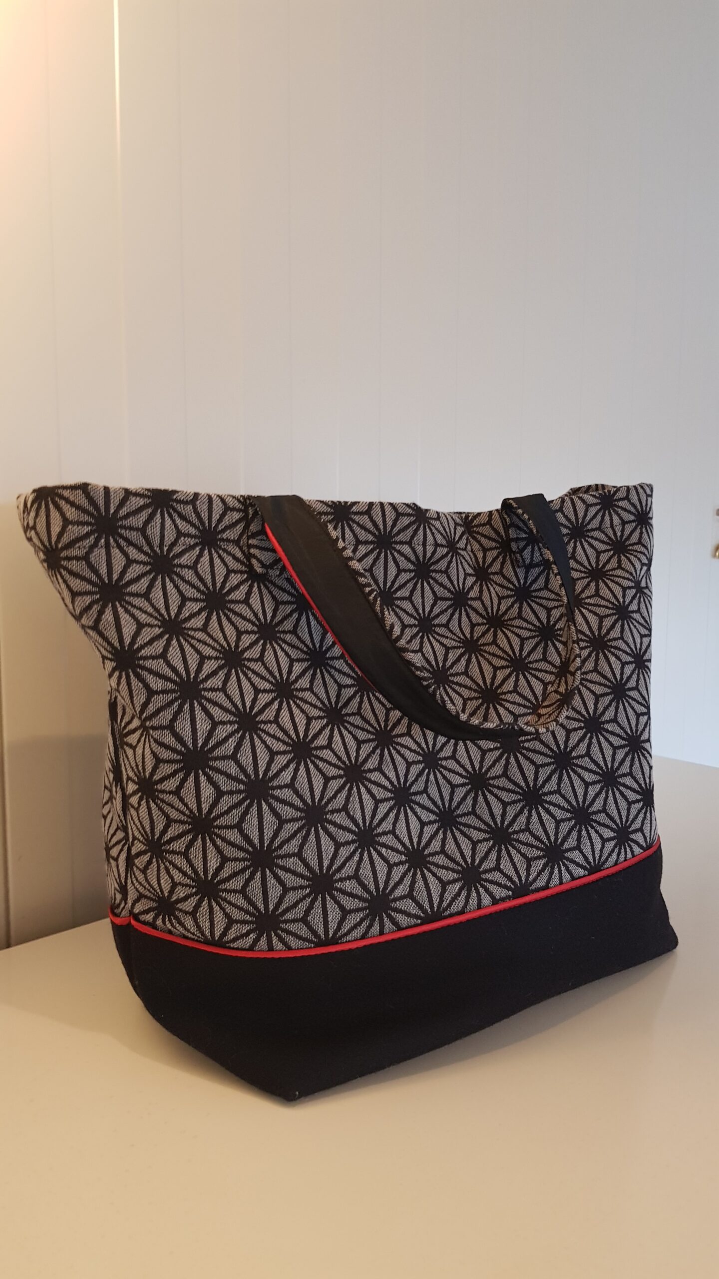 Denne veska er sydd av stoffrester og ei skjorte. Det er ikke alltid jeg klarer å bestemme meg hvilket stoff jeg skal trekke om en stol med, for eksempel. Da kjøper jeg flere alternativer, og det mønstrete stoffet ble valgt bort, og nå kom det til nytte på denne veska. Jeg hadde noen rester fra ei ullkåpe jeg sydde, så det sorte stoffet er rester fra det. Det passet utmerket sammen med det mønstrete, samtidig som at ullstoff er tykt og stivt. Å velge røde detaljer med sort og grått, er alltid en innertier. Det er kun ei stripe og sløyfa på katta som er rød, men som dere ser, er det nok til at veska får et spennende uttrykk. Foret er sydd av ei sort skjorte der jeg utnyttet brystlomma på skjorta som lomme i veska.